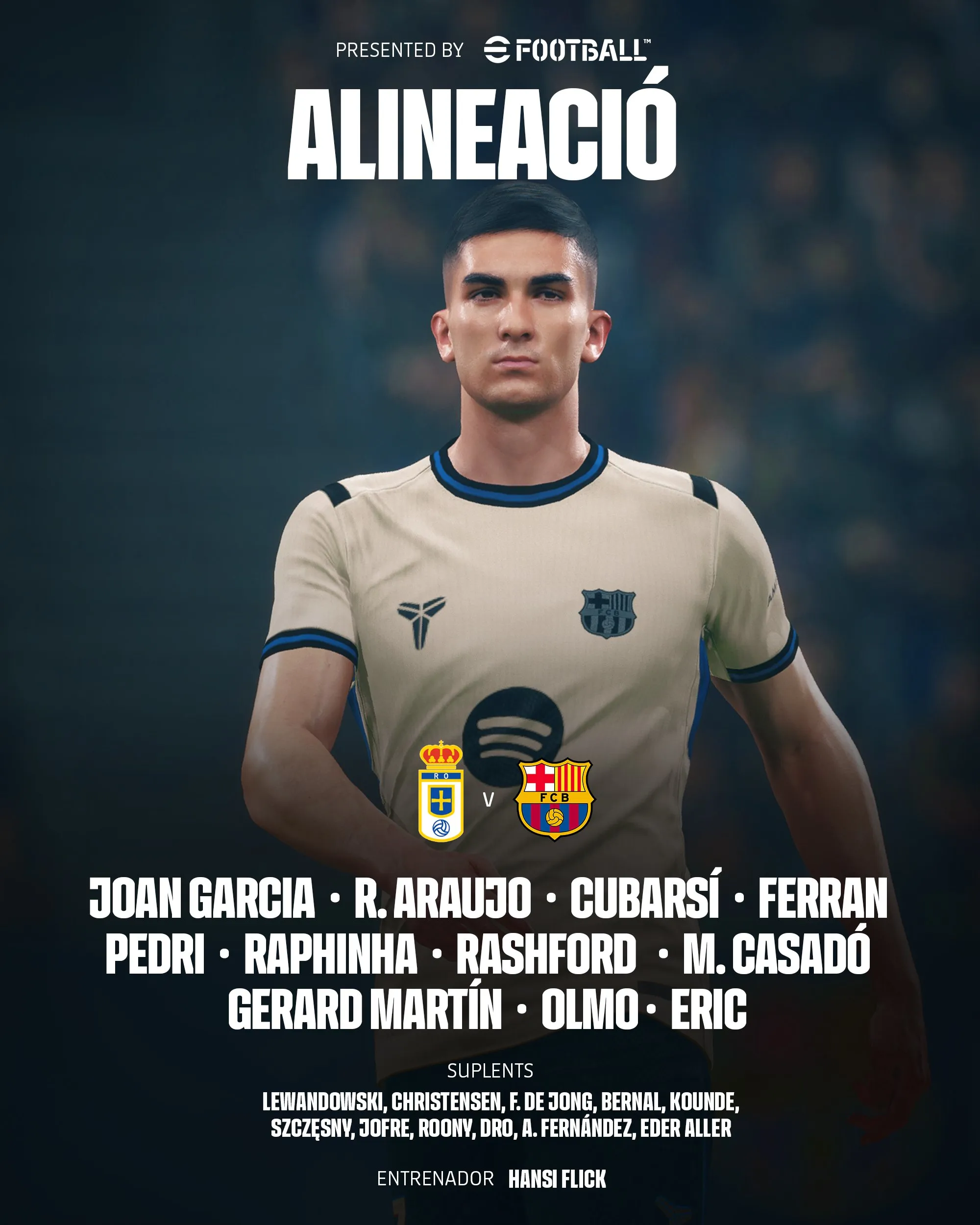巴萨替补:25-什琴斯尼、阿勒尔/15-克里斯滕森、23-孔德、26-托伦茨/21-德容、22-贝尔纳尔、27-德罗/9-莱万多夫斯基、28-巴尔德吉、29-托尼-费尔南德斯